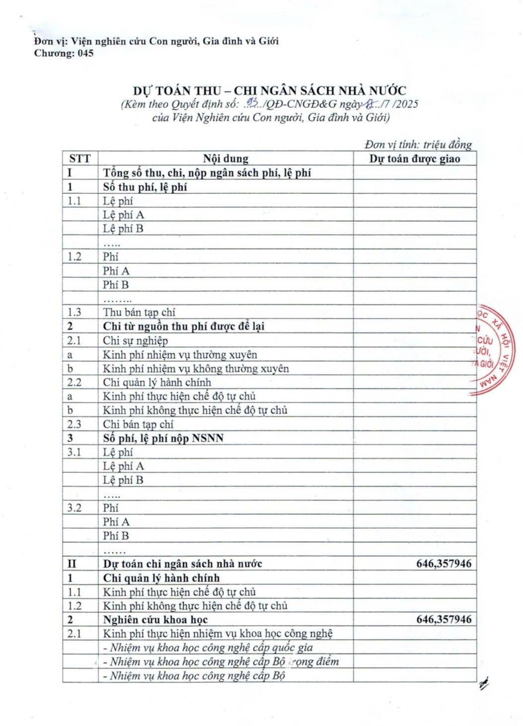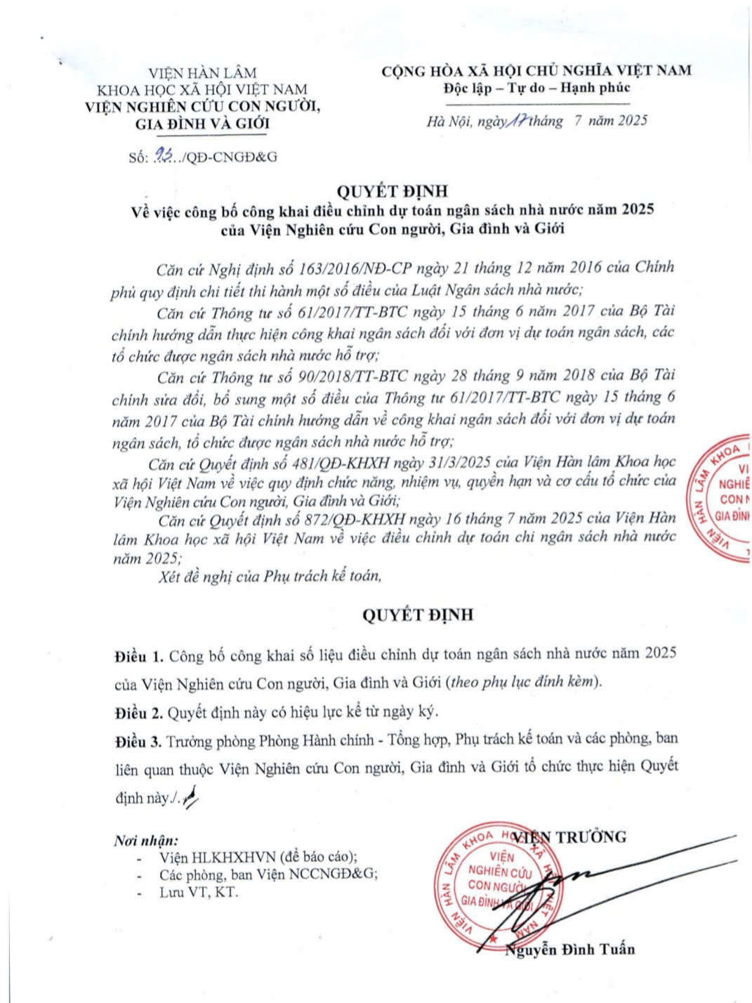 Quyết định về việc Công bố công khai điều chỉnh dự toán ngân sách nhà nước năm 2025 của Viện Nghiên cứu Con người, Gia đình và Giới