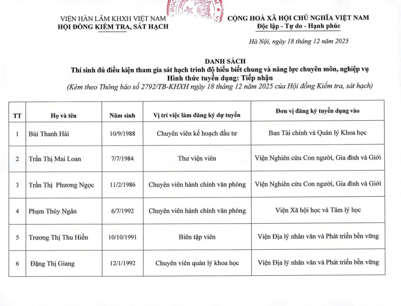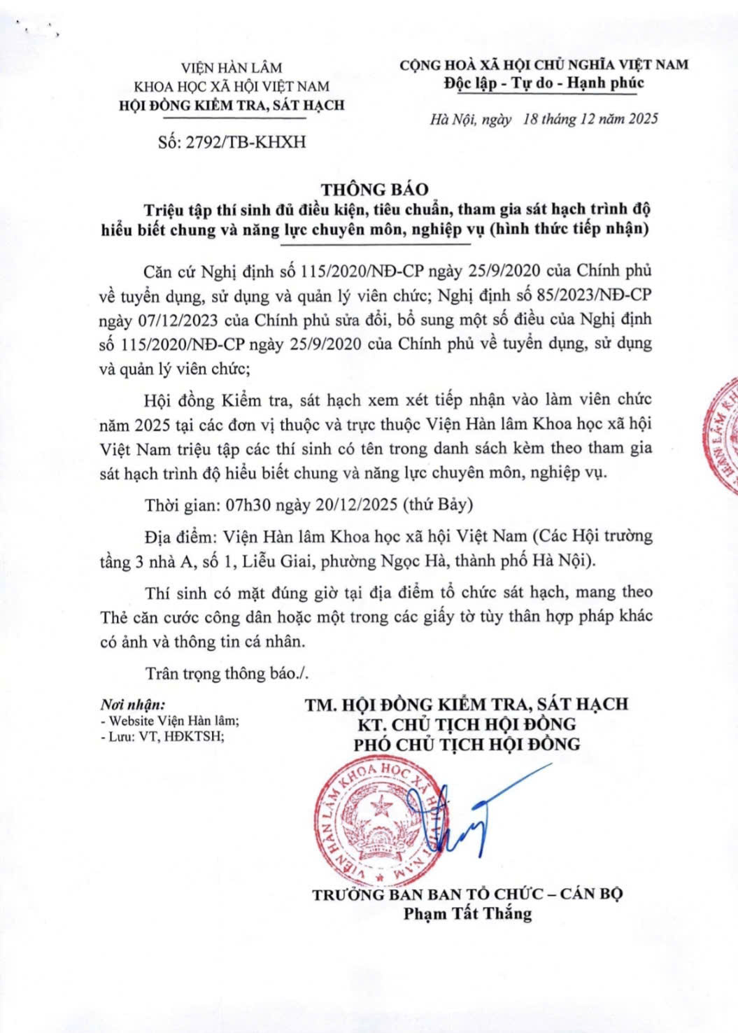 Thông báo triệu tập thí sinh đủ điều kiện, tiêu chuẩn, tham gia sát hạch trình độ hiểu biết chung và năng lực chuyên môn, nghiệp vụ (hình thức tiếp nhận)